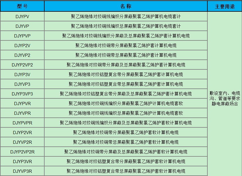本產(chǎn)品適用于額定電壓500V及以下對于防干擾性要求較高的電子計(jì)算機(jī)和自動化連接用電纜。